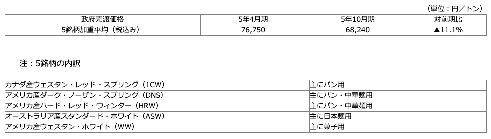 この結果、令和5年10月期(令和5年10月以降)の輸入小麦の政府売渡価格は、直近6か月間の平均買付価格を基に算定すると、5銘柄加重平均(税込価格)で68,240円/トン、11.1%の引下げとなる。