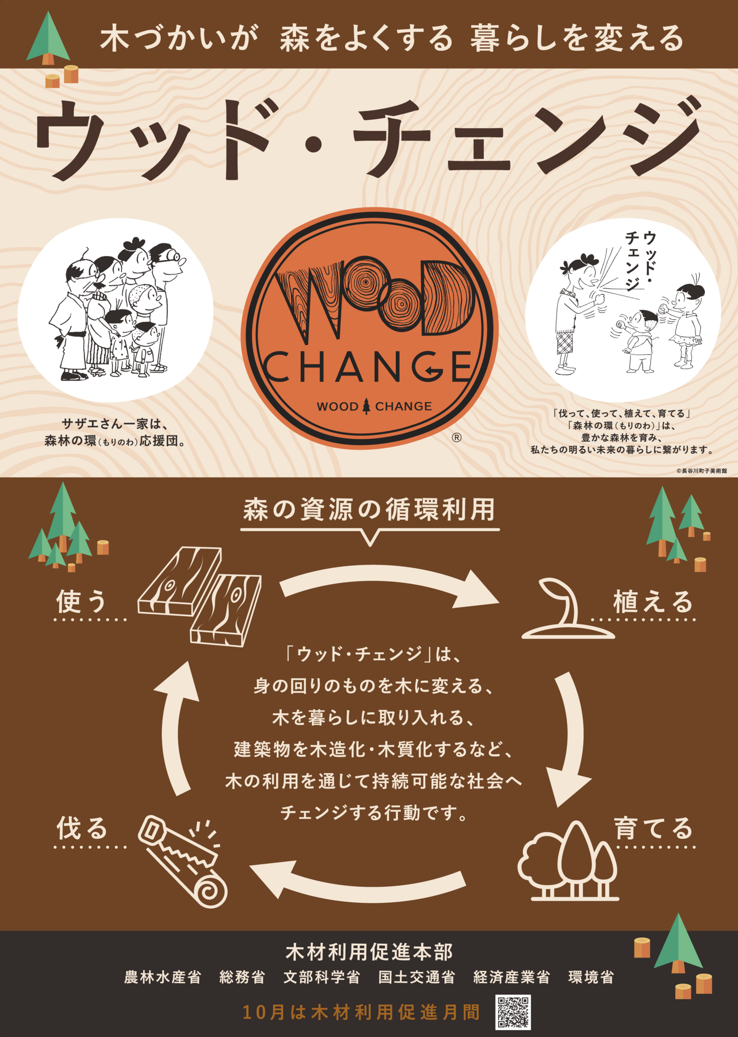今年もウッド•チェンジ*を合言葉に10月を集中期間として、木の良さや木材利用の意義への関心と理解を促す様々な取組を展開する。