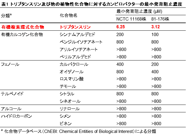 ・カンピロバクターに抗菌性を示す植物性13化合物の、カンピロバクター2菌株(NCTC 11168株及び81-176株)の 最少発育阻止濃度 6)(以下、MIC)を調べた結果、他の植物性化合物のMICは100µM以上でしたが、トリプタンスリンのMICは6.25µM以下であり、他の植物性化合物よりも効果的にカンピロバクターの増殖を抑制できることを明らかにした( 表)。