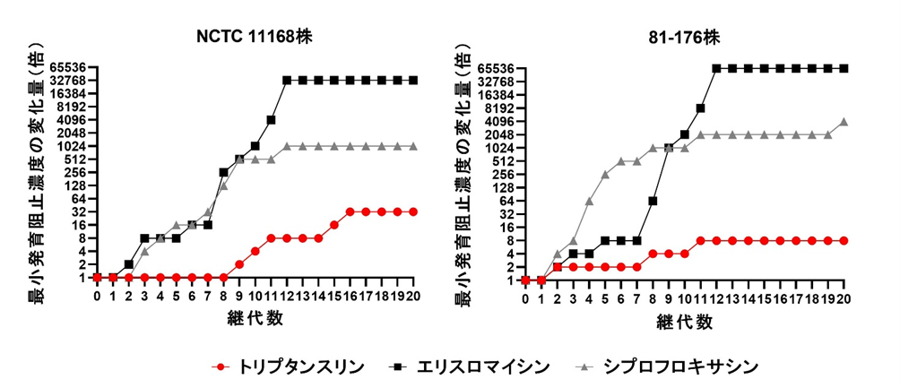 カンピロバクター2菌株(NCTC 11168及び81-176株)をトリプタンスリン含有液体培地でそれぞれ20回植え継いだところ、その最小発育阻止濃度の上昇は、抗菌剤(エリスロマイシン、シプロフロキサシン)と比較して顕著ではなく、トリプタンスリンに対する高度耐性株は出現しにくいことが示唆された。