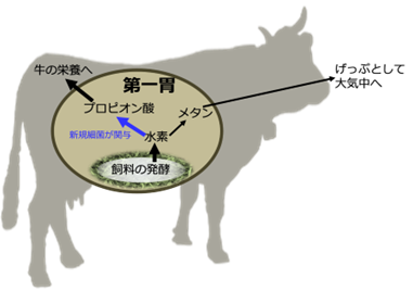 ※HPで紹介:乳用牛の胃から、メタン抑制効果が期待される新規の細菌種を発見(農研機構の研究開発成果)牛の第一胃内発酵の概略図