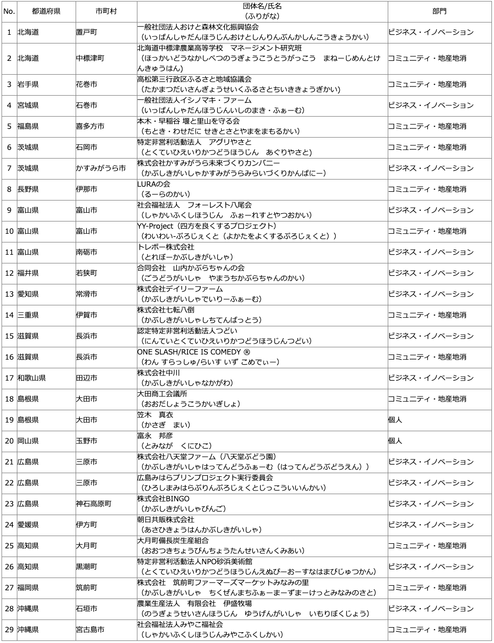 農林水産省及び内閣官房は、地域の活性化や所得向上に取り組んでいる優良事例である「ディスカバー農山漁村(むら)の宝」(第10回選定)として29地区を選定し、このうち特に優良な事例については、グランプリ及び優秀賞として決定した。また、今回は過去に選定された取組を対象に、選定後に著しい発展性がみられ、全国の模範となる事例については第10回記念賞として1地区を決定した。