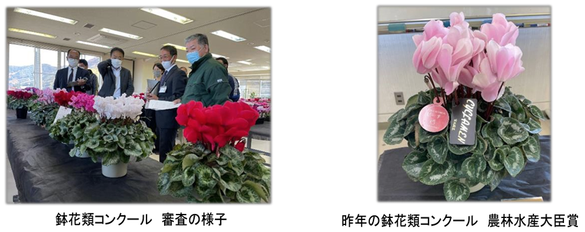 シクラメンなど県内の鉢花生産者が栽培した鉢花類を一堂に展示し、花の色合いや、花と葉とのバランスの美しさ等を競う品評会を開催する。