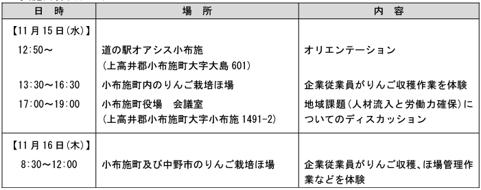 実施日は令和5年11月15日(水)~16日(木)、実施場所は小布施町及び中野市のりんご栽培ほ場(場所は当日決定)及び小布施町役場会議室となっている。