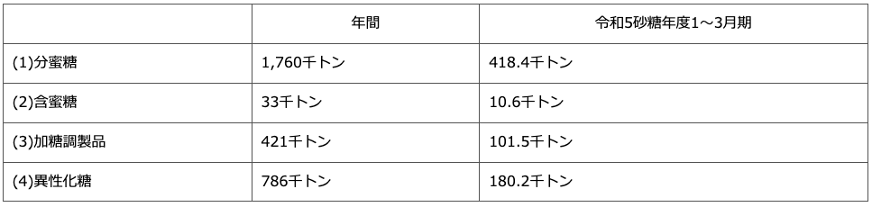 令和5砂糖年度の分蜜糖の消費量の見通しは、近年の消費動向等を総合的に勘案し、1,760千トン(対前年+0.7%、+12千トン)と見込んでいる。1~3月期の見通しは、近年の四半期別消費動向を踏まえ418.4千トンと見込んでいます。