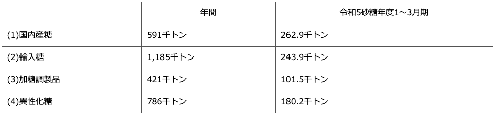 農林水産省は、砂糖等に関して適切な価格調整を図るため、令和5砂糖年度及び同年度1~3月期における砂糖及び異性化糖の需給見通しを作成しお知らせしている。