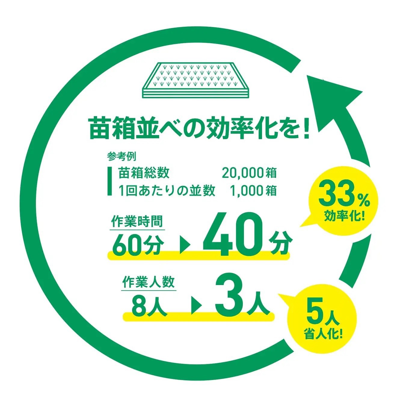 農業は身体が資本。苗箱をまだ手作業で並べている農家様、苗箱並べにまだ沢山の人手を必要としている農家さま、機械に任せられる作業は効率化し、ご自身の身体も軽労化しましょう。