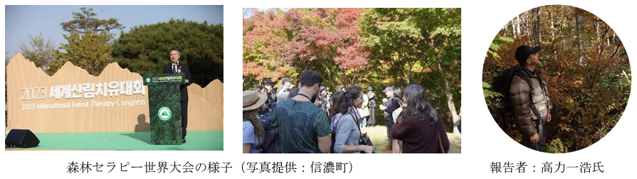 森林セラピーの発展を目的に、ガイド等の実務者が集まり令和5年10月27日から30日にかけて開催された初めての大会。森林•保健分野の専門家らによるフォーラムやガイドのデモンストレーション等が行われ、県内から小海町、松川町、信濃町が参加した。