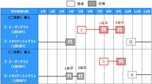 上段(例1)2回刈りを行う体系 下段(例2)梅雨明け後に播種、1回刈りを行う体系