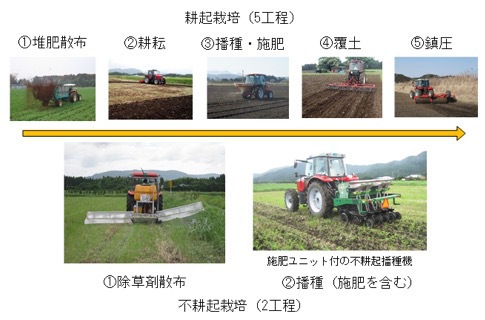 不耕起栽培技術は、ほ場を耕さずに種を播いて栽培する技術(本文では便宜上「不耕起栽培」とも表記する)。耕起栽培の播種では、堆肥散布、耕耘、播種•施肥、覆土、鎮圧と5つの作業工程を要すが、不耕起栽培では除草剤散布、播種(同時施肥)の2工程で終えることができるのが特徴だ。不耕起栽培では土壌と堆肥を混和する工程が省かれるので、耕起栽培で行われる堆肥施用はできない。