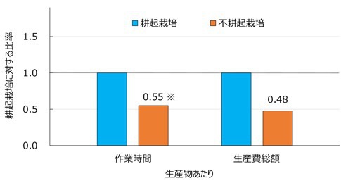 ※図中の数値は耕起栽培を1とした場合の不耕起栽培の各指標の比率。耕さずに種を播く! 飼料作物スーダングラスの不耕起播種・栽培技術の標準作業手順書を公開
