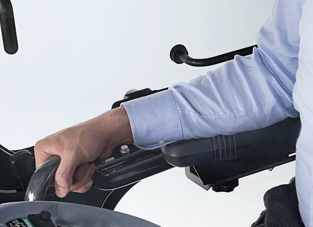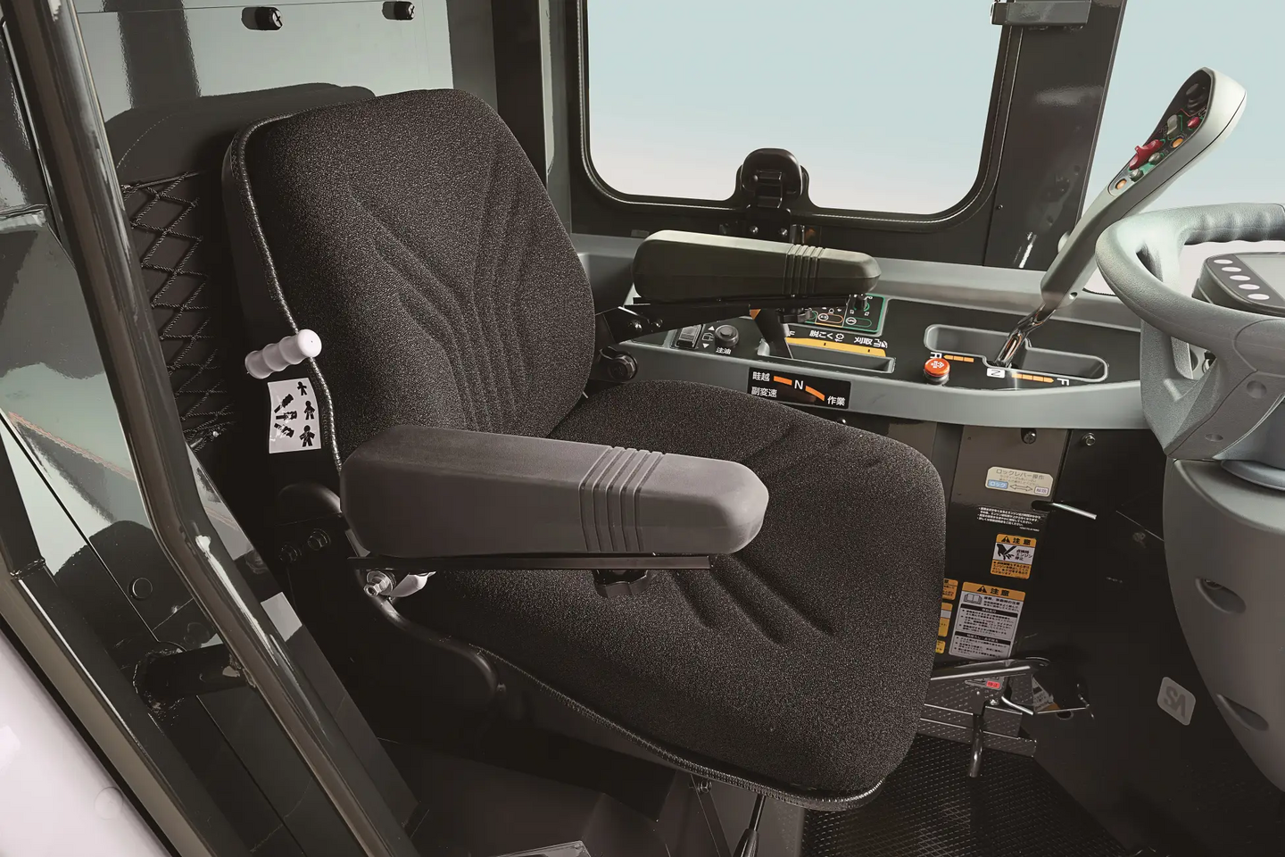 シートスイッチ付デラックスシートは前後•上下•背もたれの調節が可能。また、シート下のスイッチで人が座っているかを感知し、座っていない時は自動操舵が作動せず、誤作動を防ぐ。アームレストに持ち手が追加され、ハンドルから手を離している時でも、安定した姿勢で作業ができる。