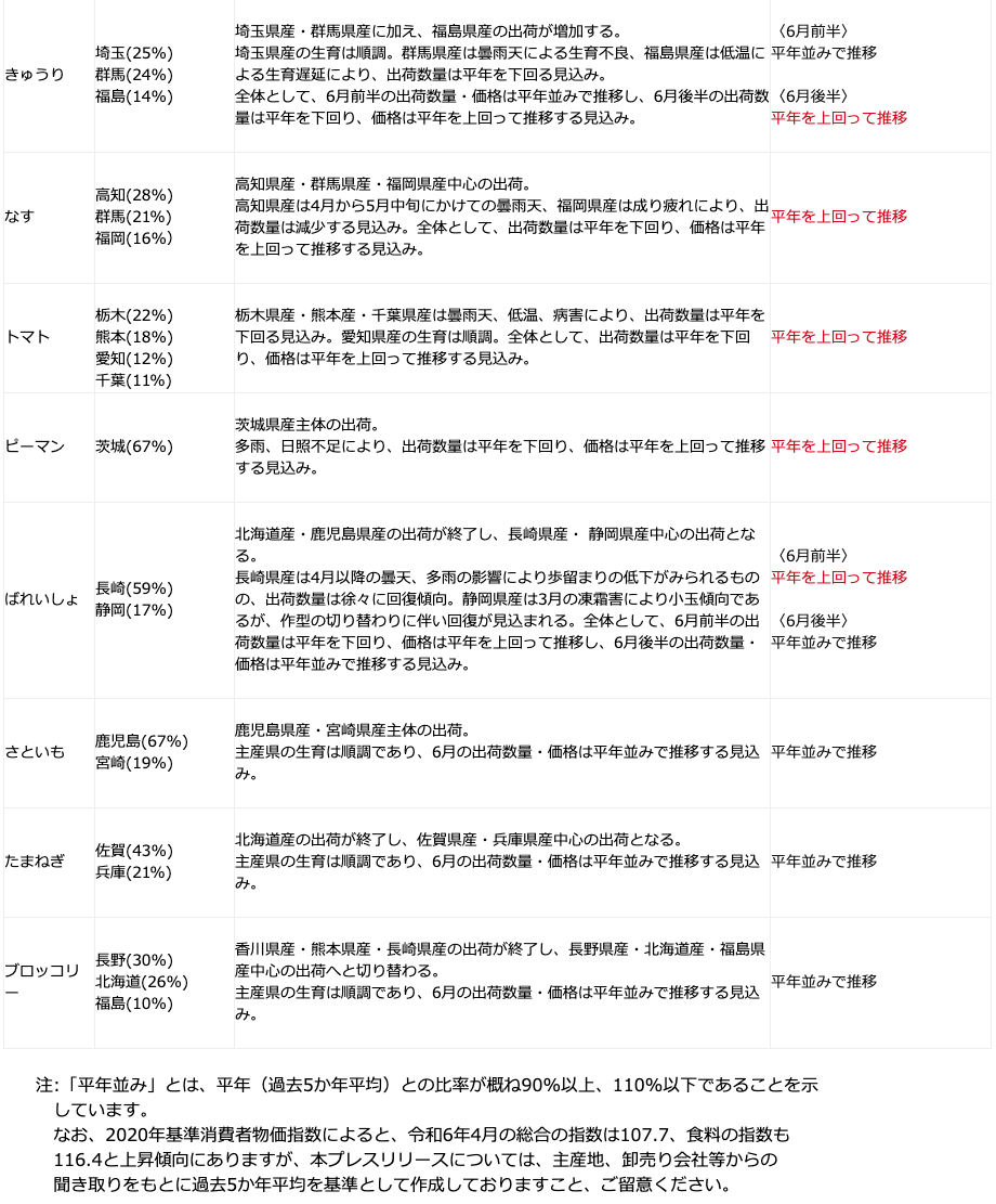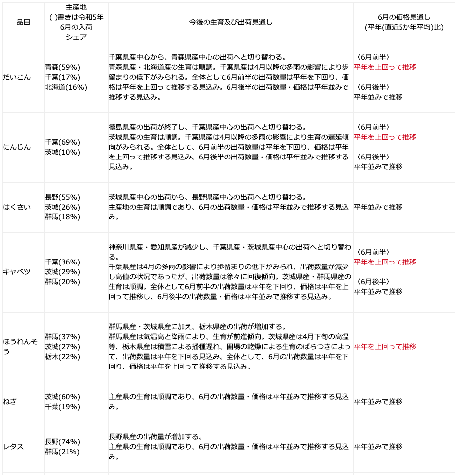 農林水産省は、東京都中央卸売市場に出荷される野菜の生育状況及び価格見通し(令和6年6月)について、主産地等からの聞き取りを行いその結果を公表している。