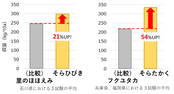 「そらひびき」は昨年、同様の観点で育成した多収品種として公表を行った「そらみずき」や「そらみのり」より早い成熟期が望まれる東北南部~北陸地域向け、「そらたかく」は、「そらみずき」より遅く「そらみのり」より早い成熟期が望まれる東海~九州地域向けの品種となっている。
