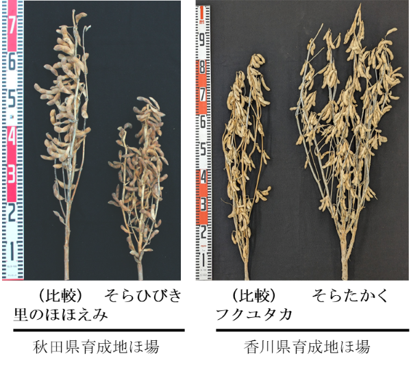 さらに「そらひびき」は草丈が低く倒れにくいという特徴をもっている。「そらたかく」の草丈は現行品種並だが、同じく倒れにくいという特徴のほかに、既存品種である「フクユタカ」と同等の 成熟期 2)であるため大豆-麦の二毛作体系への適性ももっている。また、両品種とも米国品種等に由来する葉焼病抵抗性や難裂莢性を有するという特徴をもっている。これらの品種の普及が進むことで、昨年公表した「そらみずき」「そらみのり」と共に、国産ダイズの安定生産と供給を加速化することが期待できる。