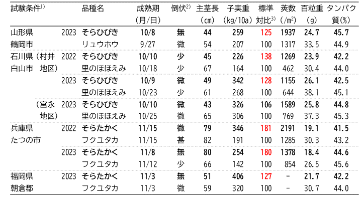 ・「そらひびき」は東北南部~北陸地域、「そらたかく」は東海~九州地域が栽培適地( 表1)。