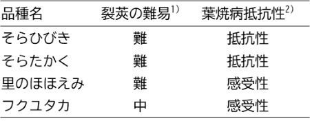 ・「そらひびき」および「そらたかく」はいずれも 裂莢性 れっきょうせい 3)は"難"であり、 葉焼病 はやけびょう 4)に対しても"抵抗性"です( 表2)。