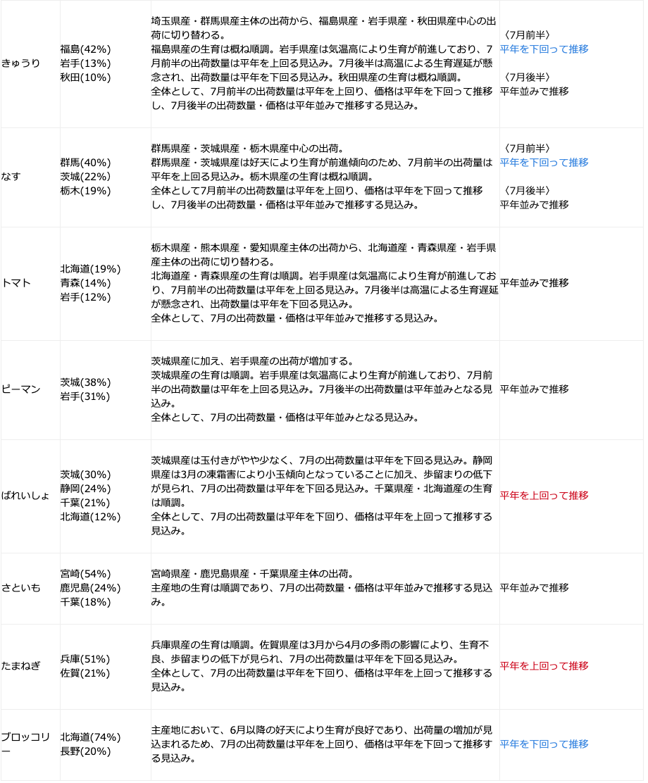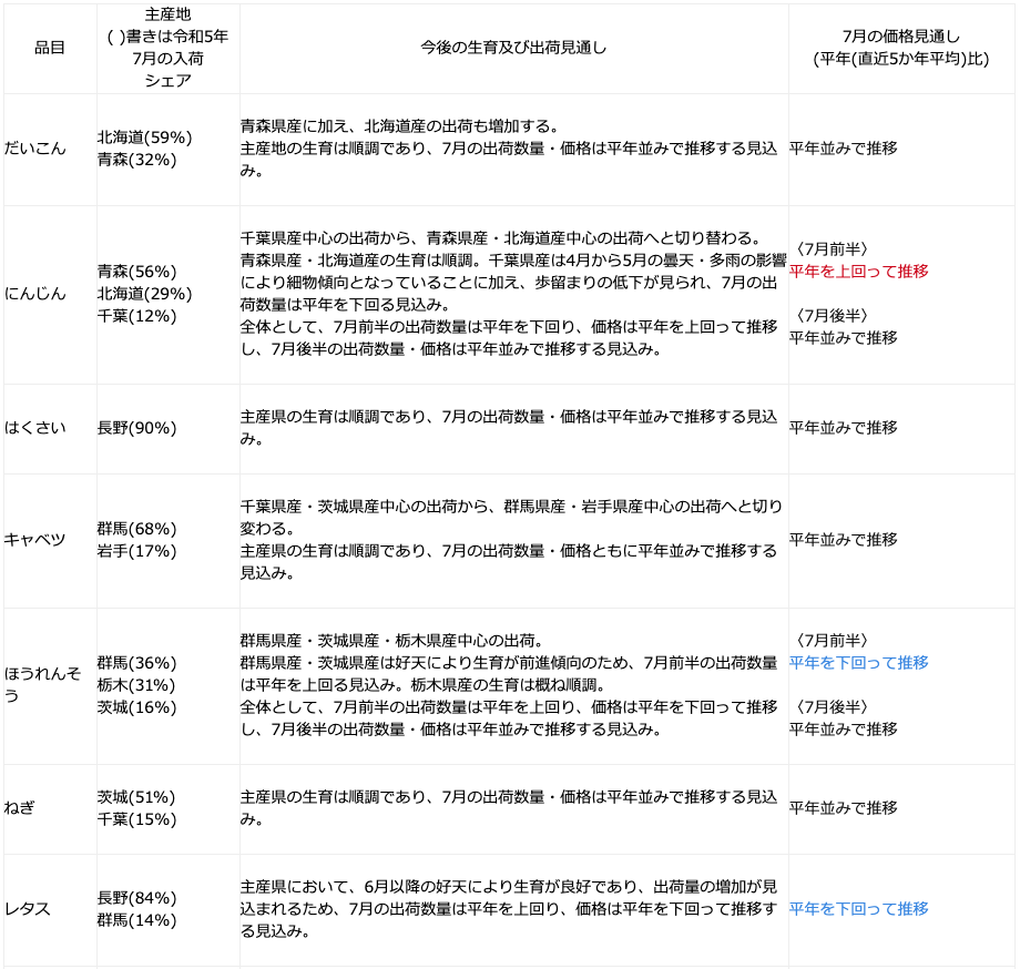 農林水産省は、東京都中央卸売市場に出荷される野菜の生育状況及び価格見通し(令和6年7月)について、主産地等からの聞き取りを行いましたので、その結果を公表します。