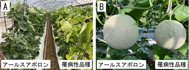 農研機構と(株)萩原農場生産研究所は共同で、世界で初めての退緑黄化病抵抗性メロン新品種「アールスアポロン」シリーズ4品種を育成した。本品種は葉が黄色くなり果実の品質を低下させる退緑黄化病が発生している地域においても、高品質なメロン果実の生産に貢献する品種として期待される。