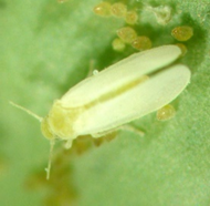 タバココナジラミ(Bemisia tabaci、カメムシ目コナジラミ科)は、体長0.7mm程度の微細な昆虫で、吸汁による植物の成長阻害や、すす病(黒いかび)を生じさせる害虫。CCYVだけでなく、トマト黄化葉巻ウイルス(TYLCV)も媒介することが知られている。