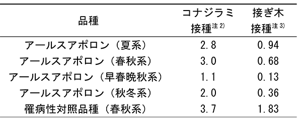 ※注3 接ぎ木接種では、CCYVに感染したメロン植物を台木にして接ぎ木することにより、CCYVを検定品種に感染させた。接ぎ木接種は、各品種10株、第1~10本葉の発病評点の平均を示している。