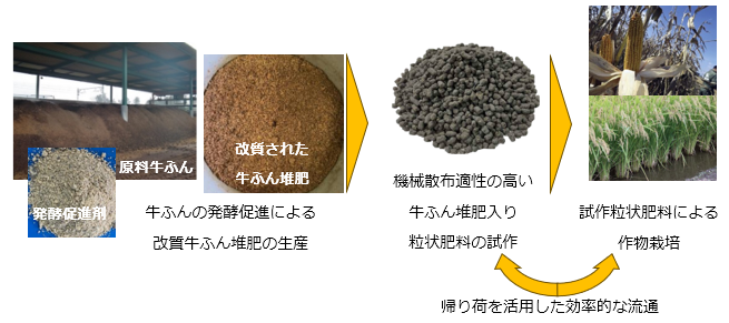 本プロジェクトでは、牛ふん堆肥の生産、造粒加工、肥料利用、流通の各段階で総合的な技術開発を行っている。