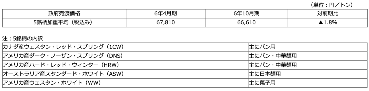 農林水産省は、「主要食糧の需給及び価格の安定に関する法律(平成6年法律第113号)第42条第2項」に基づき売り渡す輸入小麦の令和6年10月期の政府売渡価格を決定した。