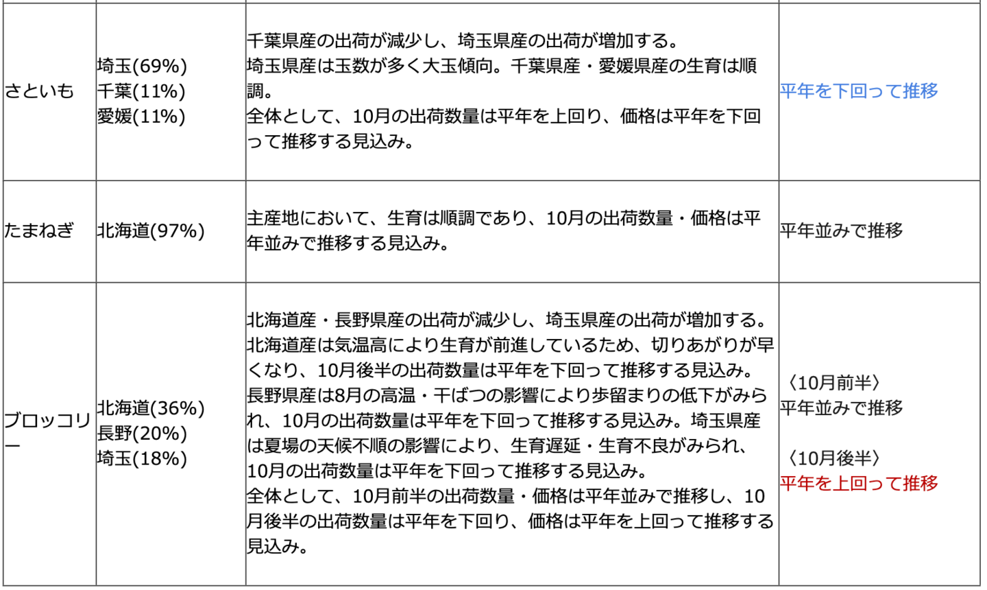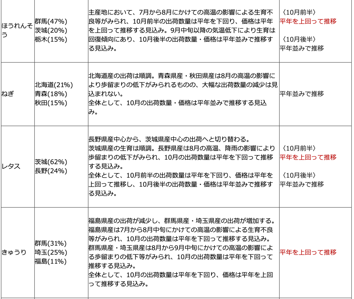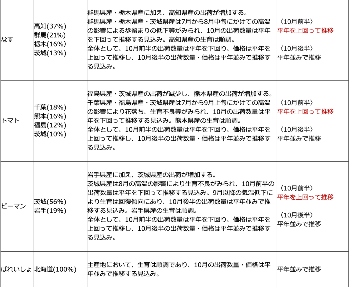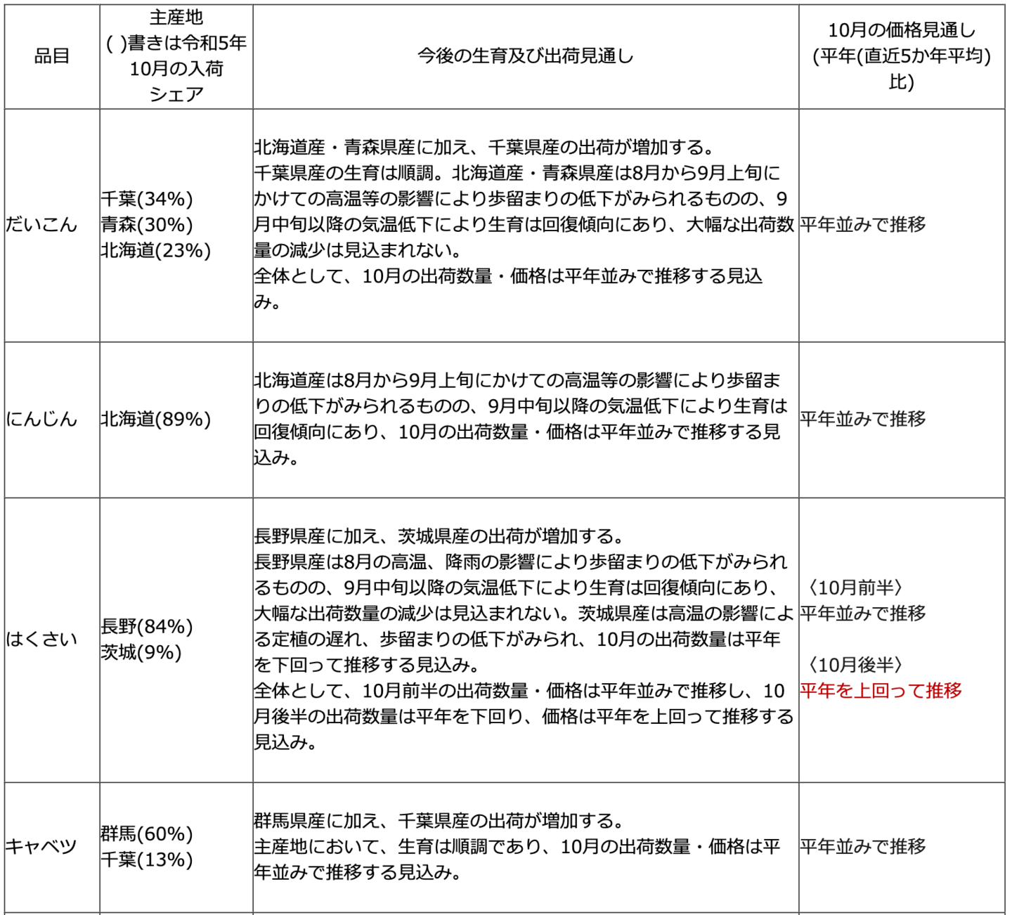 農林水産省は、東京都中央卸売市場に出荷される野菜の生育状況及び価格(卸売価格)の見通し(令和6年10月)について、主産地等からの聞き取りを行いその結果を公表している。