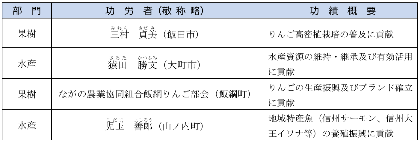 9月12日から11月2日に行われた10部門の品評会の受賞者(全104名)のうち、各部門の農林水産大臣賞(10名)、林野庁長官賞(1名)、長野県知事賞(1名)と団体賞(16団体)の受賞者の代表、計28名を表彰する。