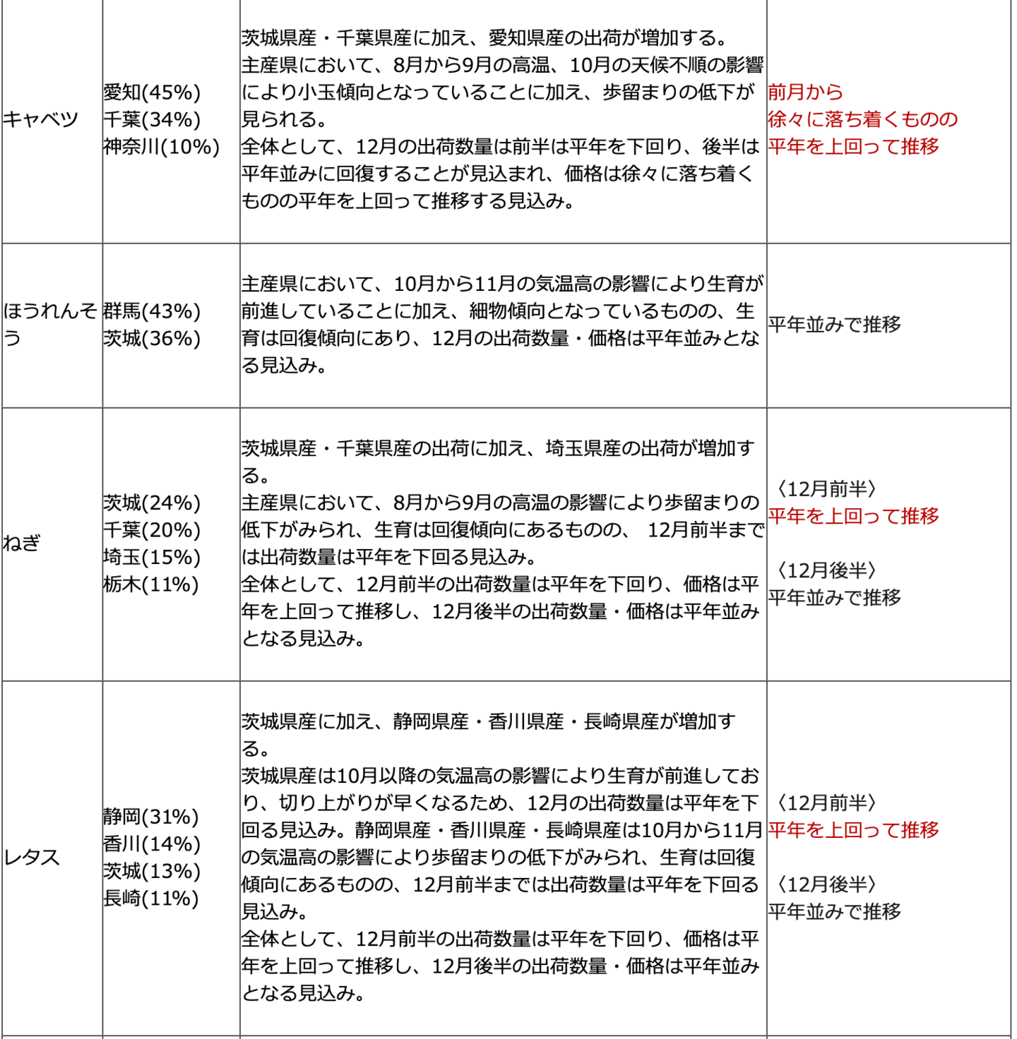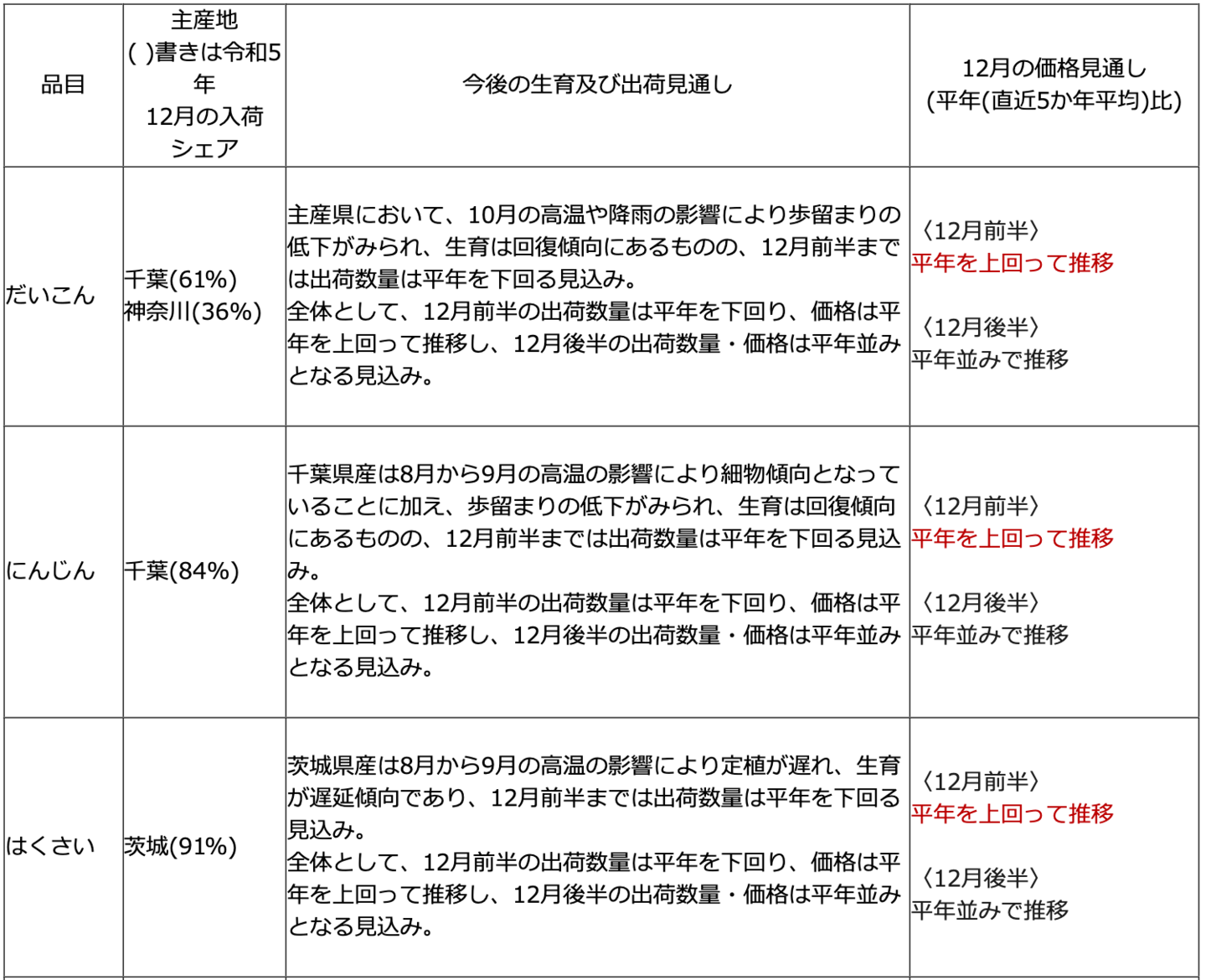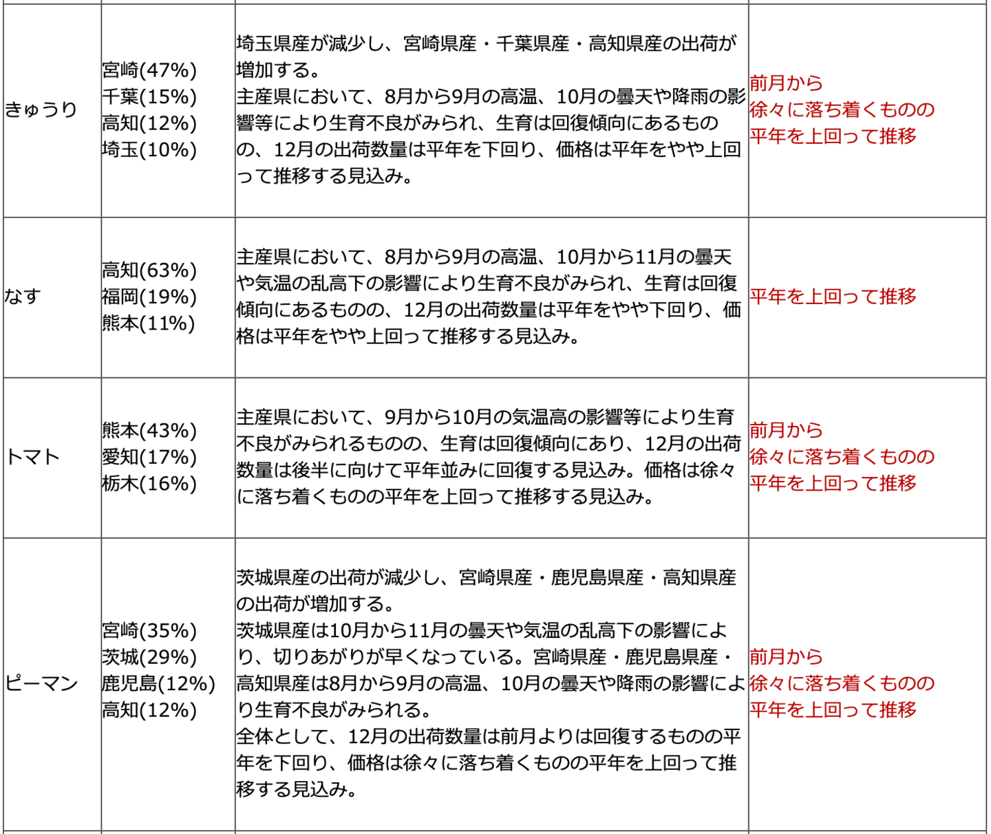 農林水産省は、東京都中央卸売市場に出荷される野菜の生育状況及び価格(卸売価格)の見通し(令和6年12月)について、主産地等からの聞き取りを行いその結果を公表している。