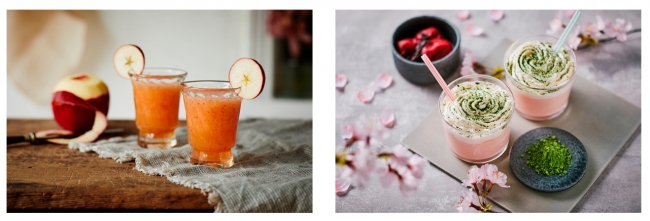 すりおろしリンゴとリンゴジュースを加えて 「ウメホリしょっぱリンゴ」( 左上図) 牛乳を割って!お好みで、生クリームと抹茶を添えて! 「ウメホリしょっぱミルク」( 右上図)