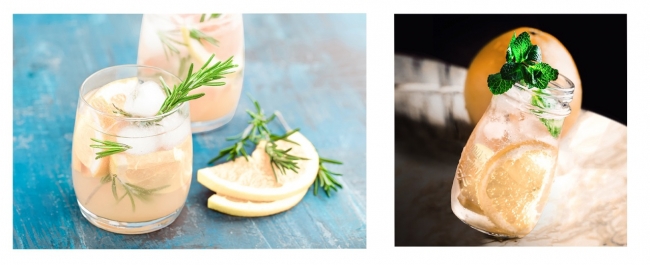 氷を入れてオンザロック 「グレホリロック」( 左上図)さっぱりとソーダ割り 「グレホリソーダ」( 右上図)