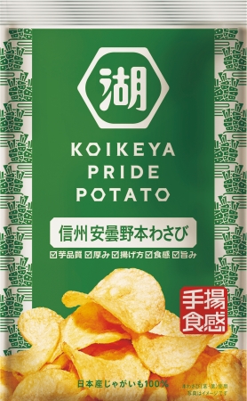 「KOIKEYA PRIDE POTATO 手揚食感」シリーズならではの絶妙な食感と濃厚なじゃがいもの旨味を引き立てる“わさび”として、上品な辛味と芳醇な香りを持った信州 安曇野産本わさびを採用し、そこに信州のそばつゆを思わせる出汁の旨味を加えることで、各素材の持った個性豊かな味わいの調和する日本料理を思わせる味わいに仕上げた。
