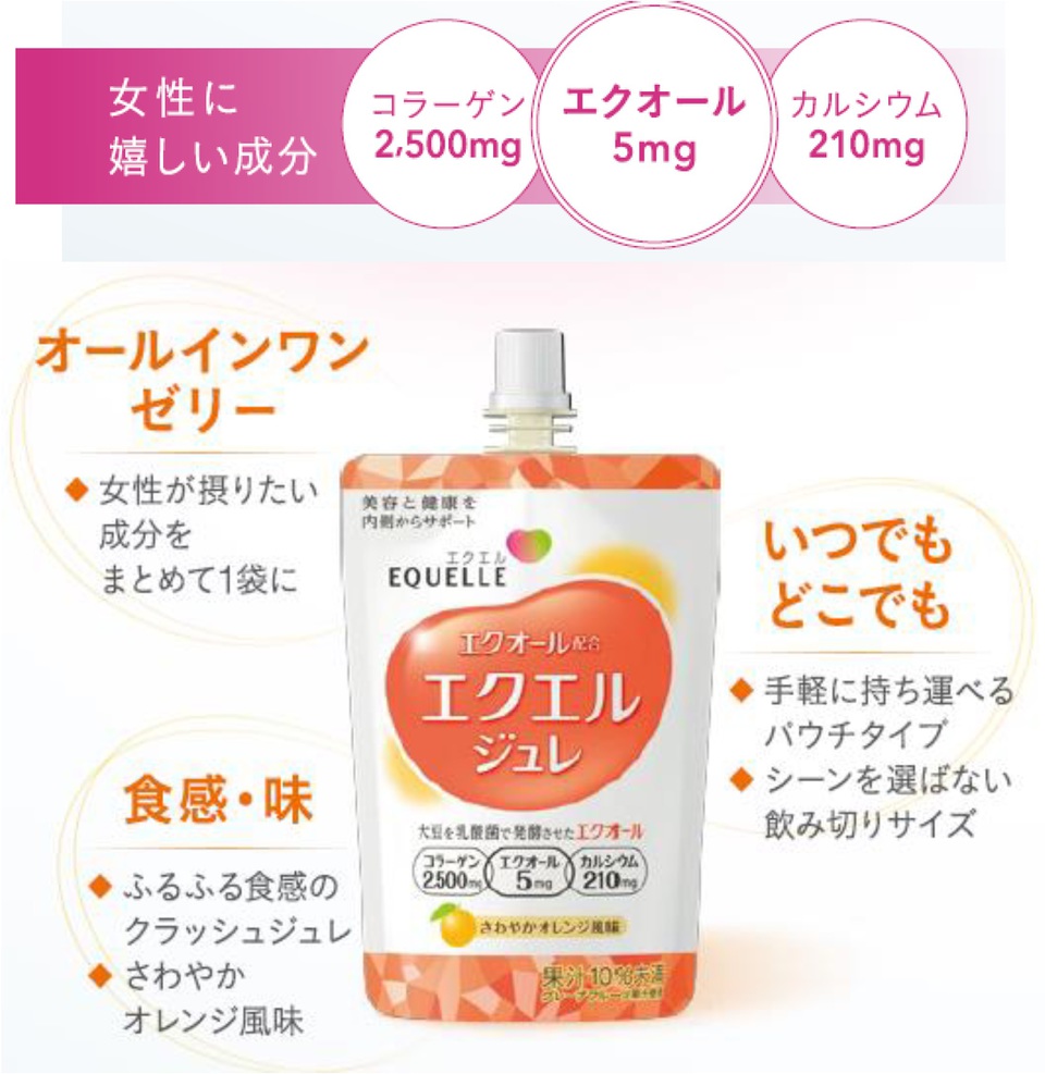 この商品は大豆由来成分エクオールをはじめ、コラーゲン、カルシウムなどを配合したものだ。女性が摂りたい成分を1袋にまとめたさわやかオレンジ風味のゼリー飲料で、カラダの内側から女性のキレイと健やかさをサポートし、美と健康の土台を支えてくれる。