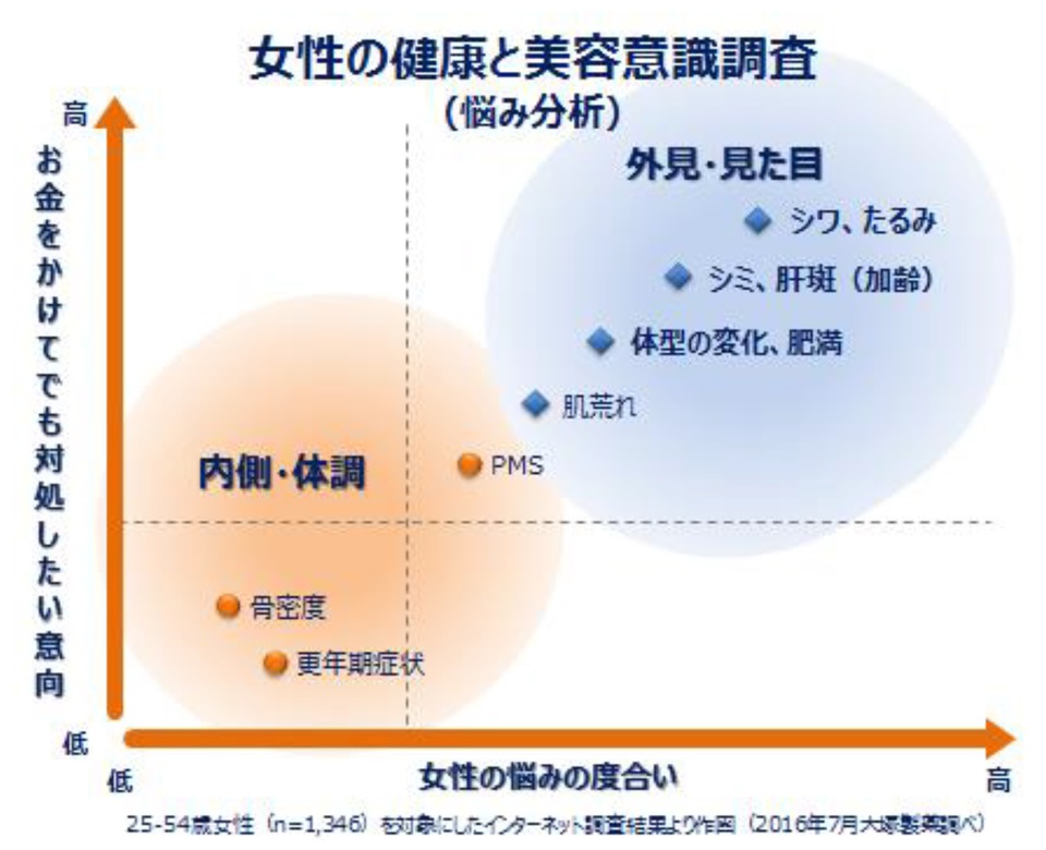 女性はライフステージの中で健康面•美容面ともに様々な変化が訪れる。同社が女性約1,300名に対し行った意識調査では、「シワ、たるみ」といった外見に関しては悩みの程度•対処意向ともに高い一方、「骨」などの目に見えない部分の健康については、悩みの程度•対処意向ともに低いことがわかった(下記図参照)。しかし、外見の美しさを維持する上で身体の内側の健康が重要な役割を担っており、早い時期から気を配ることが大切だと言われている。