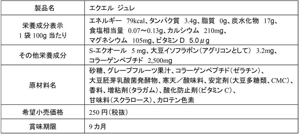 そこでいつまでも美しくいたいという女性に対し、内側のケアの大切さに気づいてもらいたいという思いから、この度大豆由来成分エクオールをおいしく手軽に摂れるエクエル ジュレを発売する。本製品で表面の美しさだけでなく、美と健康の土台となる内側をサポートするという新たな提案をしてまいたいという。