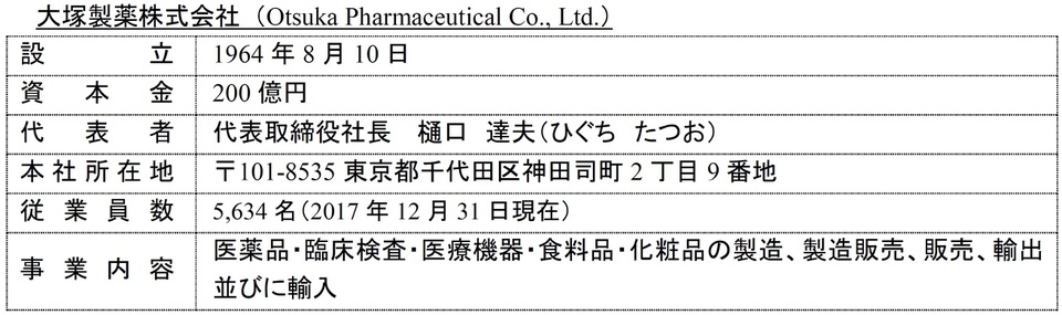 ちなみに大塚製薬(株)(URL: https://www.otsuka.co.jp/)は製造業で、本社を東京都千代田区神田司町2-9に置く。電話番号は03-5572-7351、代表者は樋口達夫氏。