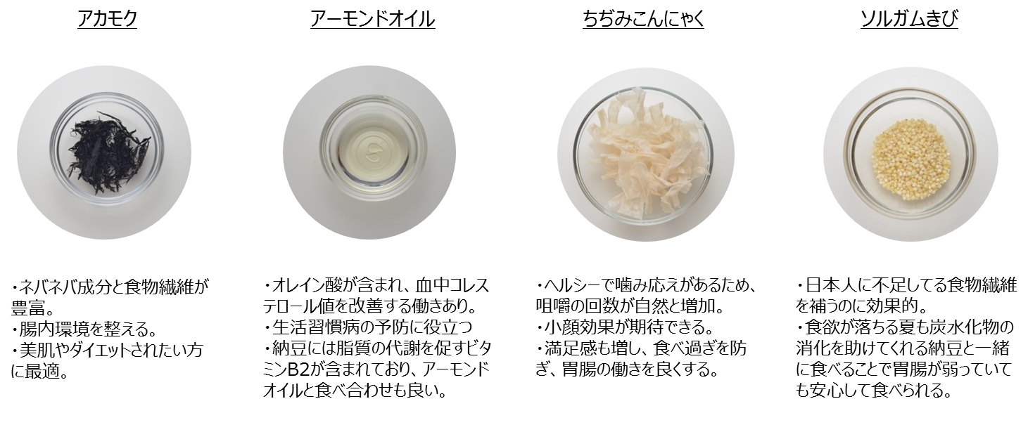 今回、金子氏も注目の4つのトレンドヘルシー食材をピックアップ。近年、スーパーフードといわれ始めたアカモク、お肌にそのまま塗っても、食用でも使えるアーモンドオイル、低カロリーで食物繊維が豊富なちぢみこんにゃく、ヘルシーな雑穀としてアメリカで注目されているソルガムきびをレシピに採用した。