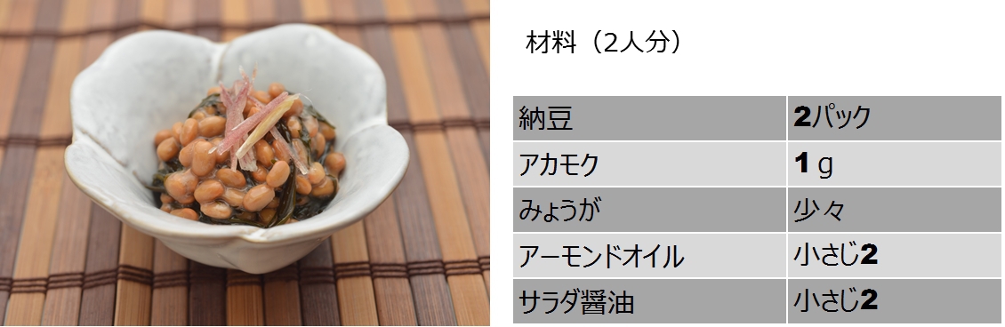 ・合わせるだけで完成する、簡単で栄養価の高いレシピだ。ミネラル類が豊富なアカモクとコレステロール値低下作用のあるアーモンドオイルが納豆の口当たりをマイルドにしてくれる。料理する前日の夜にアカモクを戻しておけば朝食にも最適だ。