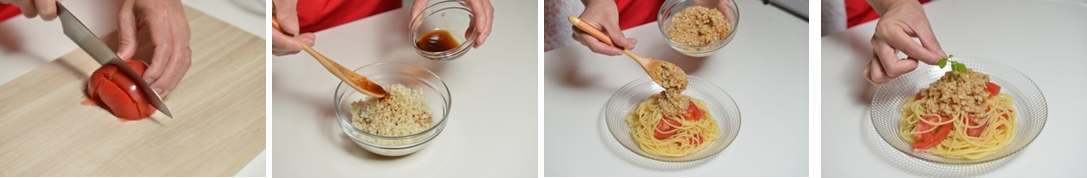 ④スパゲティーは指示通りの時間茹で冷水にとり、水を切ったらオリーブオイルとトマトを合わせる。