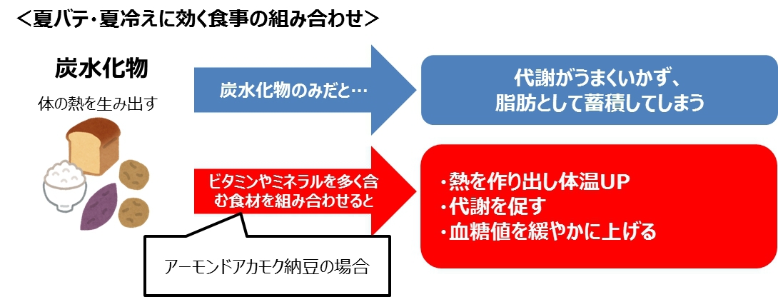 夏は薄着や肌の露出が増えるため、容姿を気にして、ダイエットされる方が増加傾向にある。カロリーを気にし過ぎて、低カロリーな食品ばかり摂取していると夏バテや冷えのリスクを高める。体の熱を生み出すために一番良い食品は炭水化物だ。一方で、炭水化物のみを摂取した場合、代謝がうまくいかず、脂肪として蓄えられてしまうため、食事の組み合わせがポイントになる。