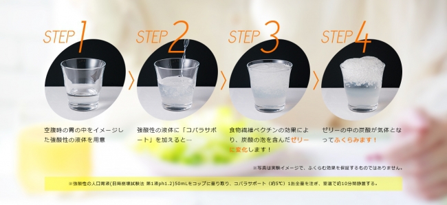 胃液が空腹時には強酸性、満腹時には弱酸性になる性質をもっていることに着目し、独自開発した「コバラセンサー技術」を採用。強酸性の胃液に混ぜたときにはゼリー状に変化、弱酸性のときには変化しないという設計技術で特許も取得した。