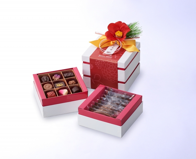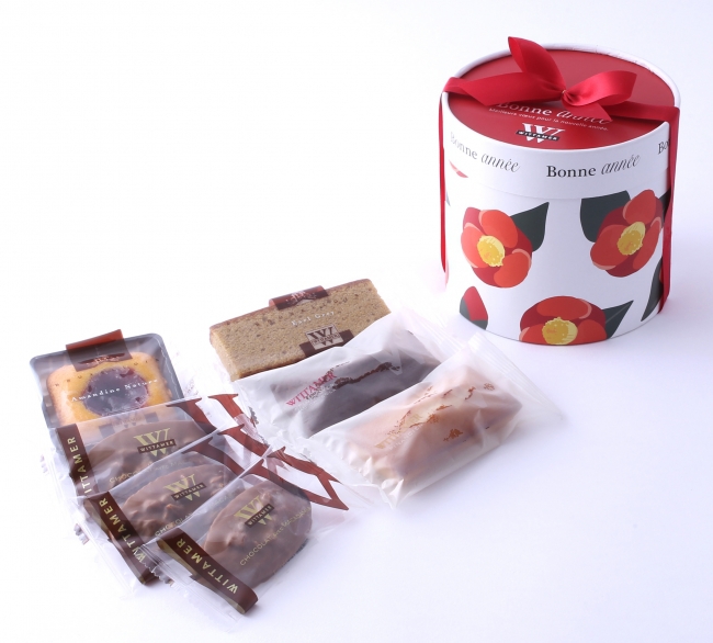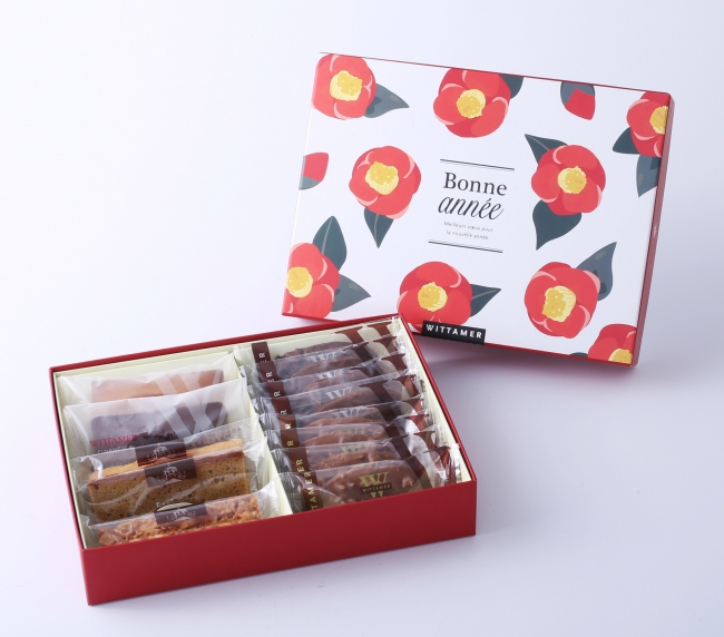 椿をデザインしたお正月限定パッケージに人気の洋菓子を詰め合わせた。