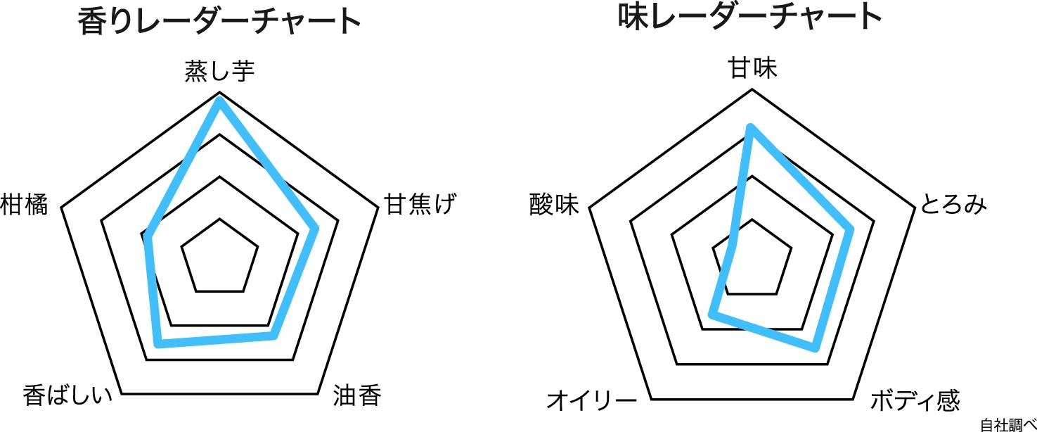 原料のさつまいもの香り「蒸し芋」由来の特徴が非常に強く感じられる。そこに「甘焦げ」「香ばしい」などの評価が付随し、多面的に魅力ある香りを実現している。