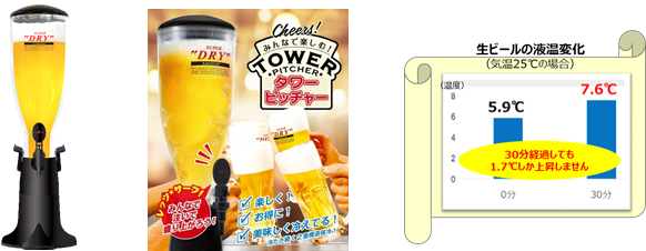 お客様にビール注ぎを楽しんでいただくことを目的として、容量約3リットルの「タワーピッチャー」を展開する。1回の充填で約3リットル程度の提供が可能となり、テーブルに配置後はお客様ご自身に樽生ビールを注いでいただくことで、飲食店のオペレーション軽減にもつながる。