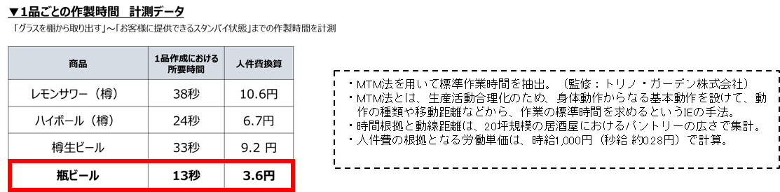 また、一般的にびんビールは提供オペレーションが簡易な商材であり、優先してびんビールを販売することで、従業員の作業負荷軽減につながる。