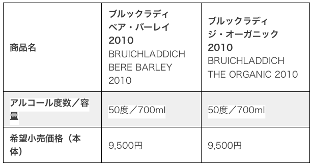 Cointreau Japan(株)(レミー コアントロー ジャパン/東京都港区/宮﨑俊治代表取締役)は、アイラ・シングルモルト・スコッチウイスキーブランド「ブルックラディ」より、スコットランド•オークニー島産の古代品種大麦を100%使用した「ブルックラディ ベア•バーレイ 2010」と、全生産工程がオーガニックとして認証されている「ブルックラディ ジ•オーガニック 2010」を、10月1日(火)より発売する。