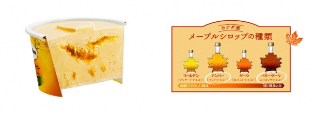 本商品はコクが豊かなメープルアイスクリームの中心部に、芳醇な香りが特徴のとろりとしたメープルソースを加え、さらに食べ進めると香ばしいバタークッキーが現れる、最後まで飽きることなくお楽しみいただけるフレーバーだ。