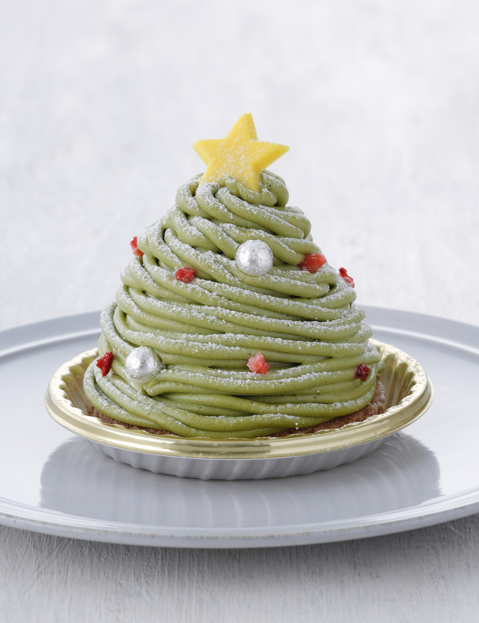 ■商品説明:小さなクリスマスツリーをイメージしたピスタチオのケーキ。香ばしいビスキュイの上に、酸味のあるグリオットチェリーの果肉入りジュレ、まろやかな甘さのホワイトチョコクリームをのせピスタチオのムースリーヌを絞った。クリスマスらしく星形のチョコレートやアラザン、甘酸っぱいフリーズドライの苺をトッピングし華やかに仕上げている。