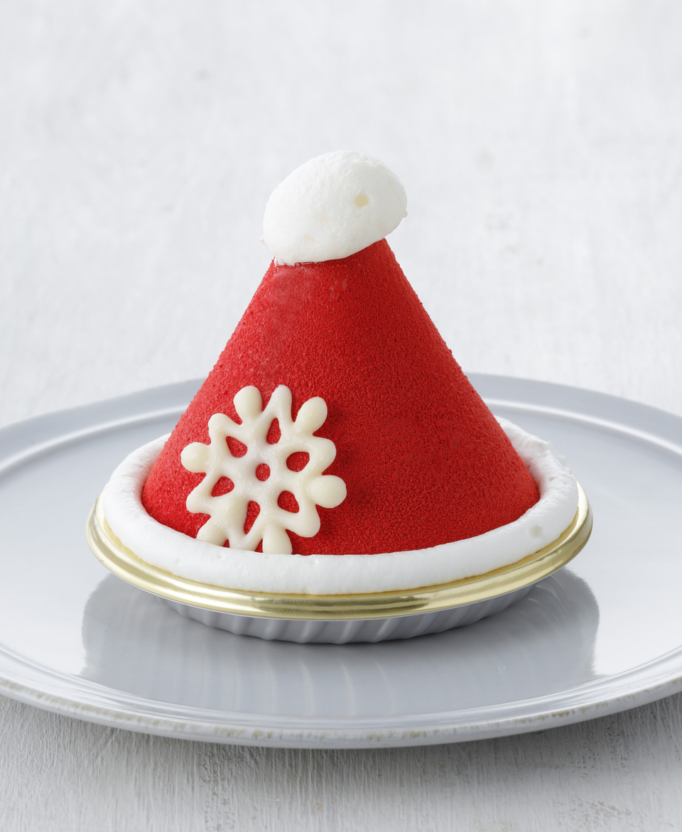 ■商品説明:サンタクロースの赤い帽子に見立てた甘酸っぱいベリーのケーキ。クルミ入りビスキュイの上に、芳醇な香りを持つタイベリーのチーズムース、4種のミックスベリージュレ、爽やかな酸味のベリームースを合わせた。シャンパンや白ワインとの相性もぴったりで、クリスマス気分が楽しめるスイーツだ。